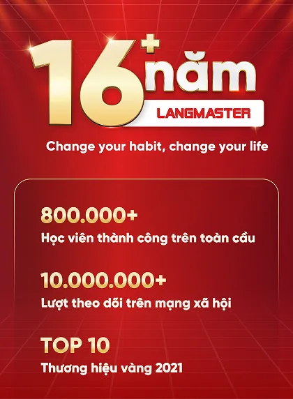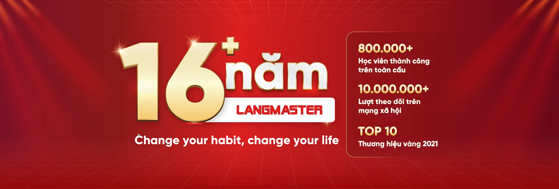 Với 16+ năm kinh nghiệm, Langmaster đã đào tạo thành công 800.000+ học viên trên toàn cầu, 95% học viên đạt mục tiêu đầu ra. Không chỉ dừng lại ở việc đào tạo tiếng Anh, chúng tôi muốn truyền cảm hứng cho học viên, thay đổi niềm tin và thói quen để trở thành những người thành đạt có trách nhiệm với gia đình và xã hội!